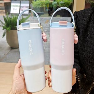 Gradient Color Insulated Water Bottle with Carrying Handle & Charm Pendant, 900ml Stylish Portable Thermos Cup for Daily Use